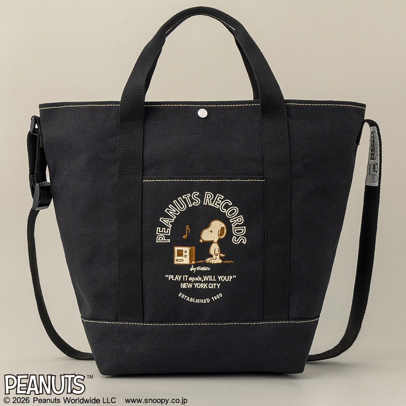 ブラック地に、アクセントとなるベージュステッチ。フロントに施したスヌーピーの刺しゅうが、クラシックな雰囲気に上品さを添える舟形トートバッグ。