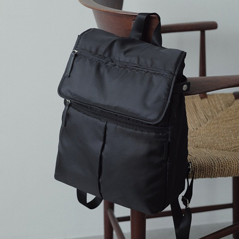 ダイレクトにアクセスできる背面ファスナーや取り出しやすいフラップ部分のポケットなど、人気のギミックはそのままに、ふかふかの中綿入りのナイロン調生地を使って、約半分の重さに軽量化。