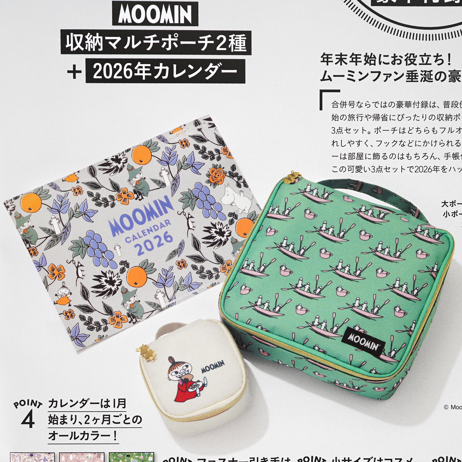 合併号ならではの豪華付録は、ムーミンの世界観をぎゅっと詰め込んだ3点セット。普段使いはもちろん、年末年始の旅行や帰省にもぴったりな収納ポーチ2種とカレンダーが登場です。
