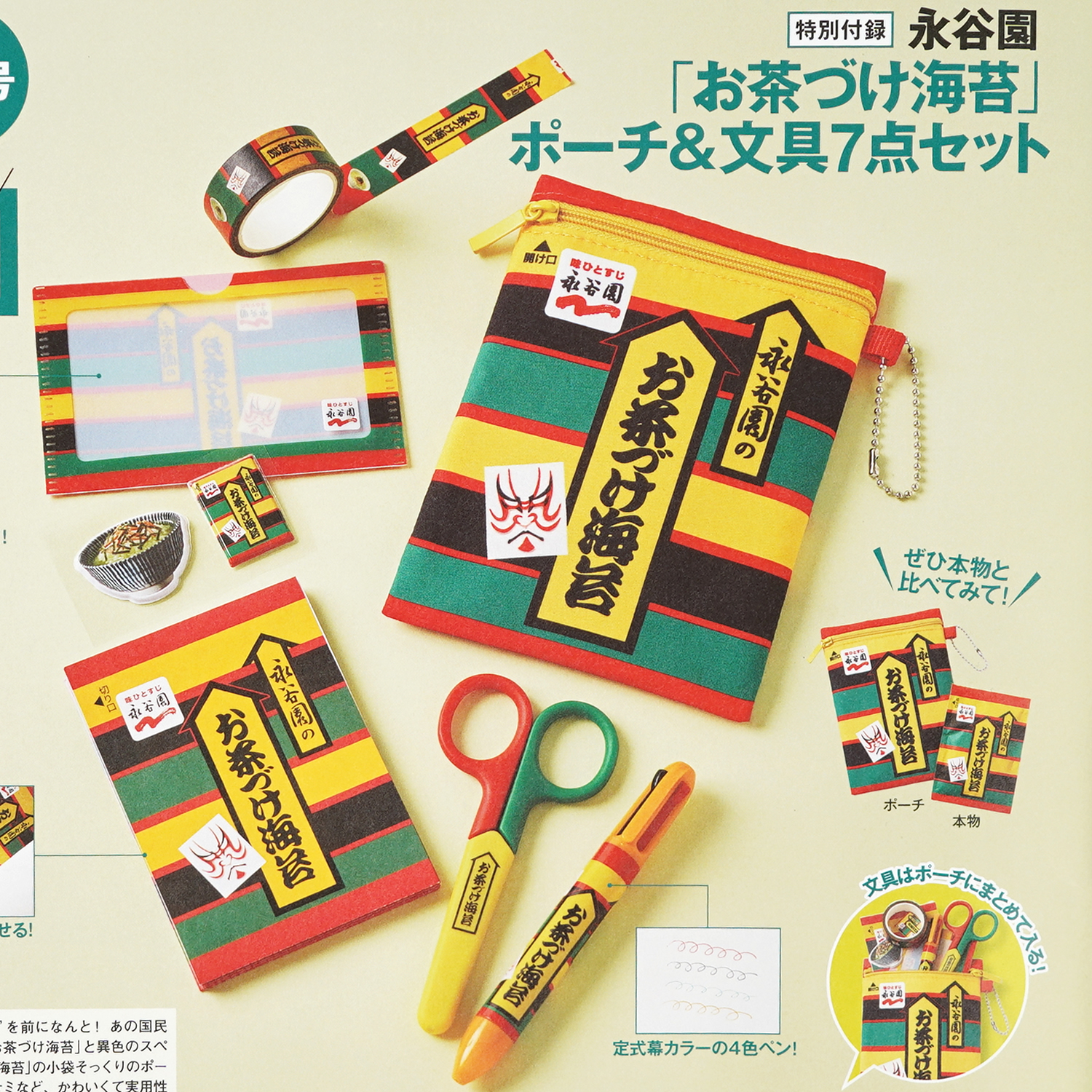 「お茶づけ海苔」の小袋そっくりのポーチをはじめ、メモ帳やハサミなど、かわいくて実用性も備えた豪華7点セットです。