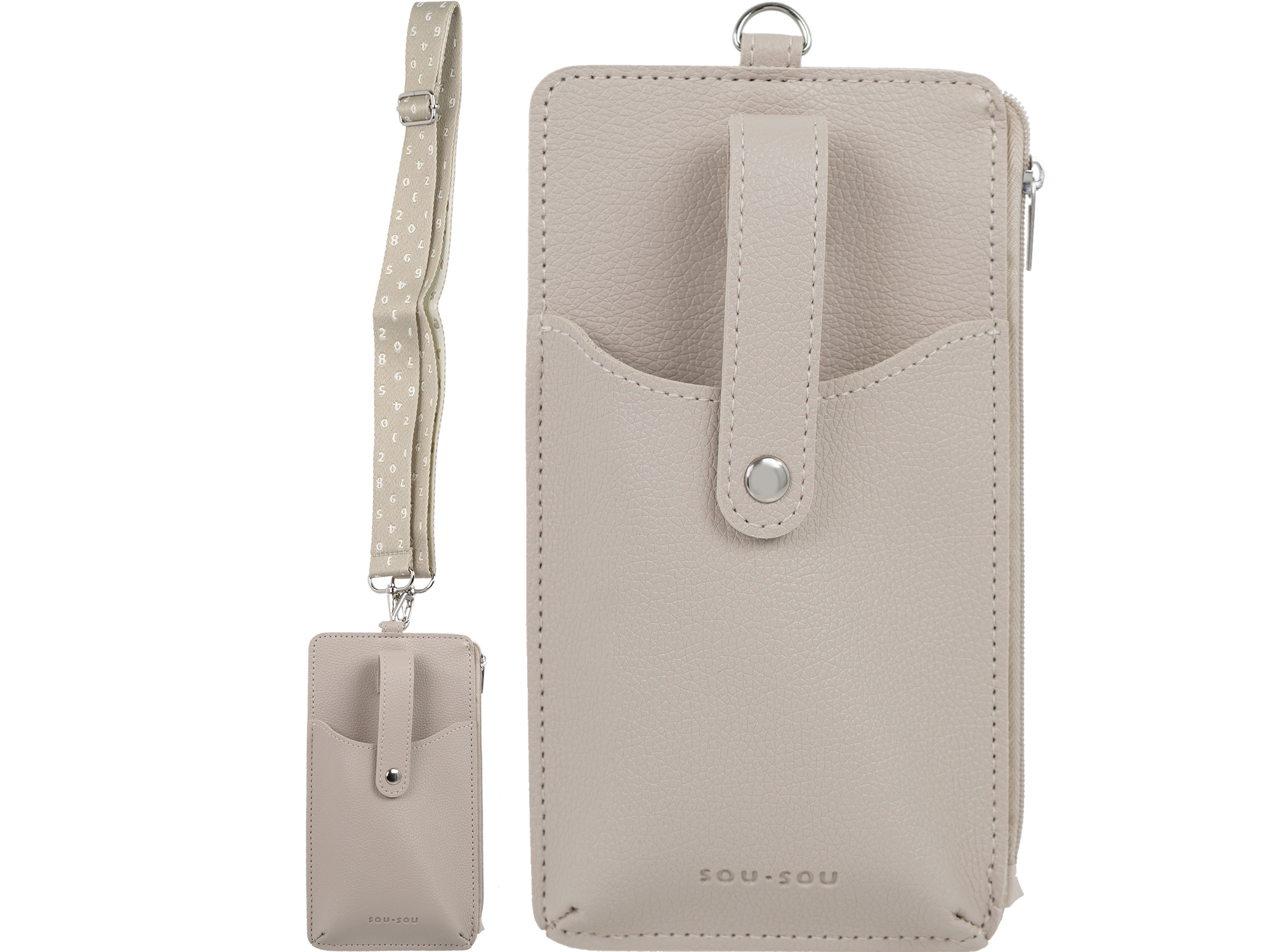 幅広ストラップに「SO-SU-U(ソスウ)」柄が織り込まれたスマホポシェットレザー調の本体にさりげない型押しのロゴが素敵。ストラップの裏面は色味が反転。ちらっと見えてもおしゃれ