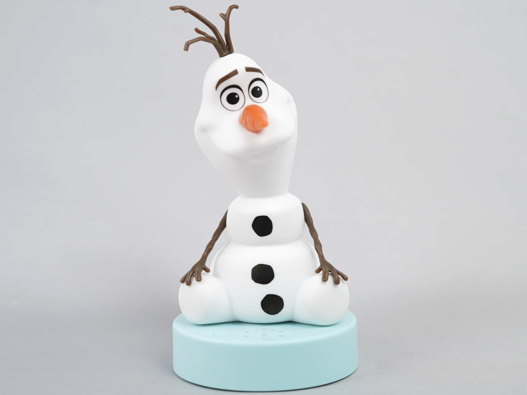 映画「アナと雪の女王」の登場キャラクター、オラフのお部屋ライトです。お部屋ライトは3段階調光の昼光色で、その光り方は振動を与えることで弱→中→強と切り替わります。また、1時間経過すると自動OFFするタイマーや、電源ボタンを押すことでボイス「やぁみんな、ぼくはオラフ。ぎゅーって抱きしめて!」が毎回再生される機能がついてました。