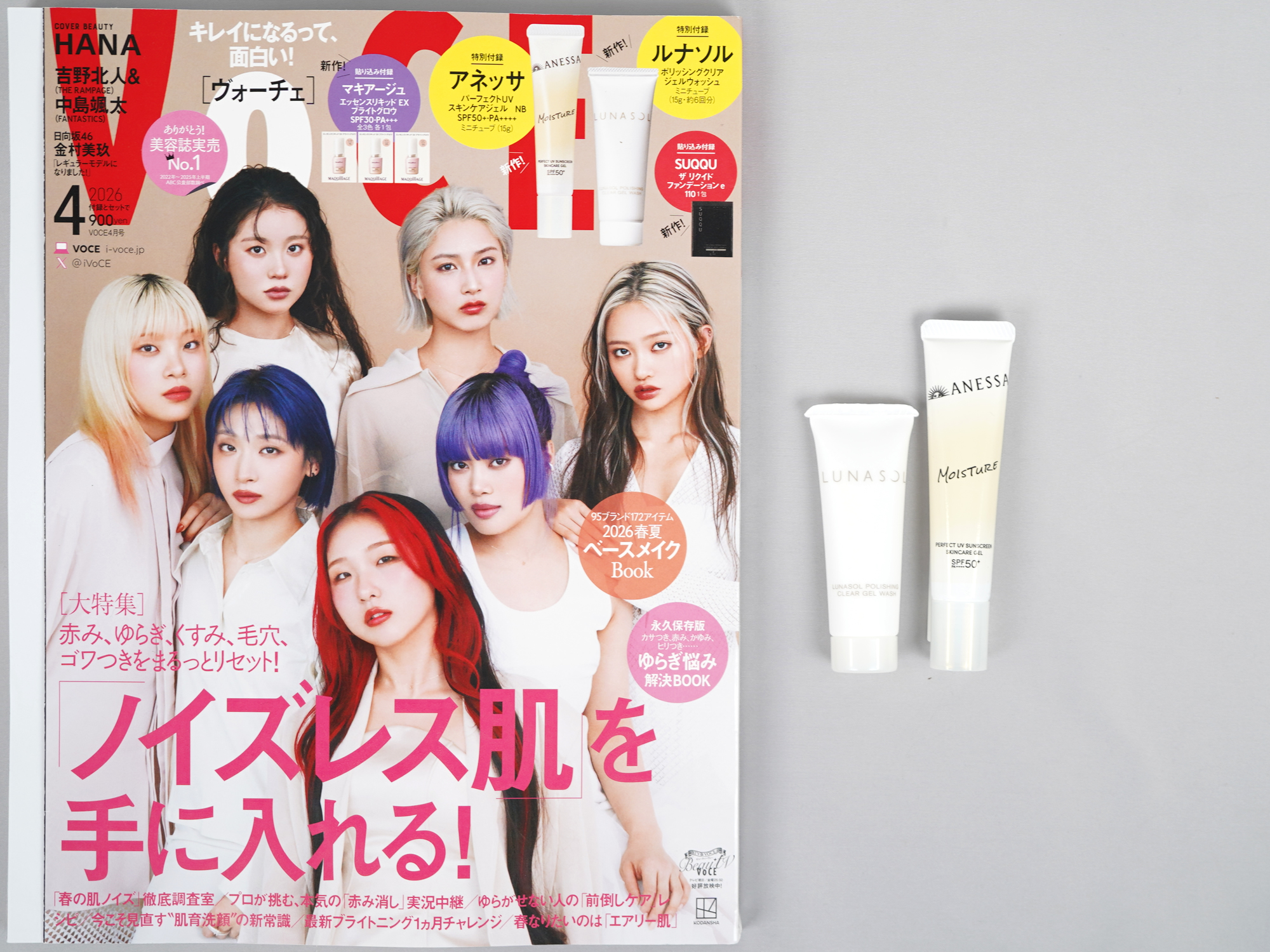 | 発売日:2026年2月20日 講談社 VOCE (ヴォーチェ) 2026年 4月号 900円(税込) 《付録》 アネッサが本気で考えた“デイリーUV”、LUNASOLの新生・導入美容液洗顔 |
